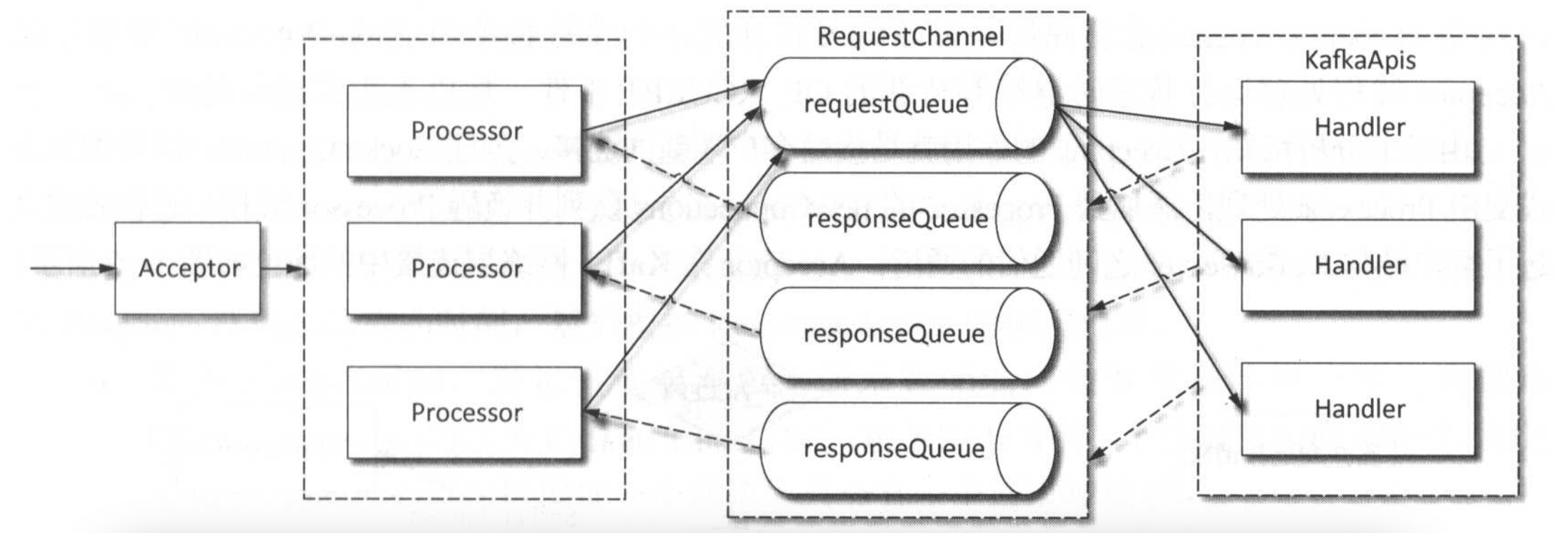 sendRequest(request):Processor调用此方法将请求放入requestQueue。receiveRequest(timeout):KafkaRequestHandler调用此方法从requestQueue取出请求(阻塞等待,超时返回null)。sendResponse(response):KafkaRequestHandler调用此方法将响应放入对应Processor的响应子队列。receiveResponse(processorId):Processor调用此方法从自身响应子队列取出响应。