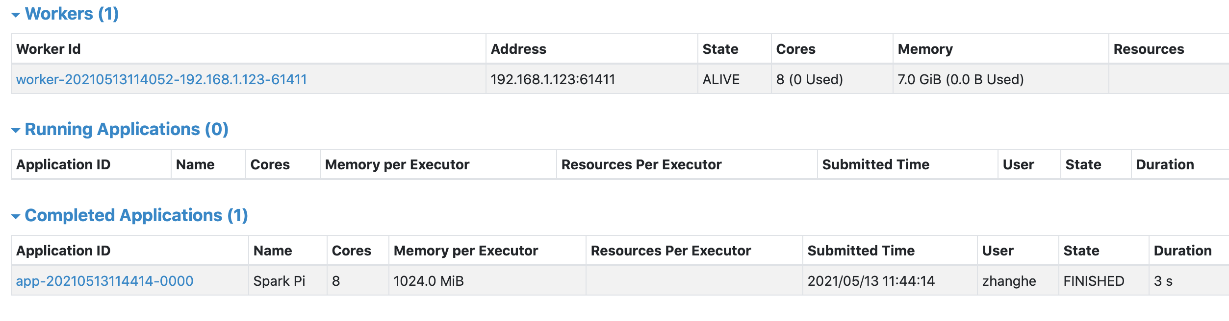 Spark Master UI(Standalone) | http://localhost:8080 | 查看集群节点、资源使用、应用列表 |