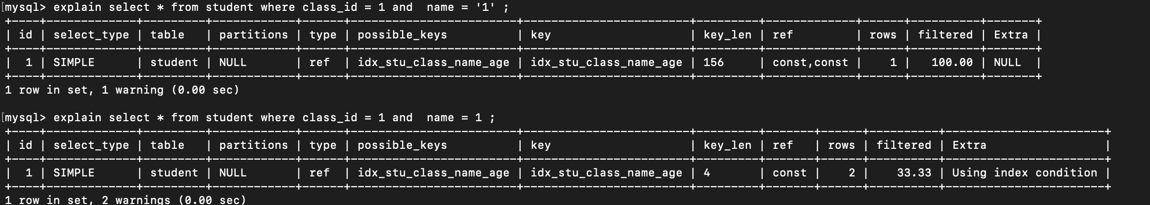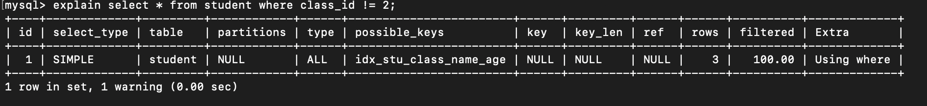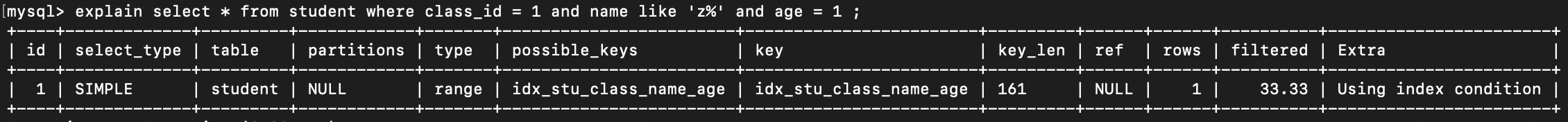 (class_id, name, age),若查询条件不含class_id,或跳过name直接用age,索引失效。 - 规则:从左到右依次使用,不能跳过前面的字段。