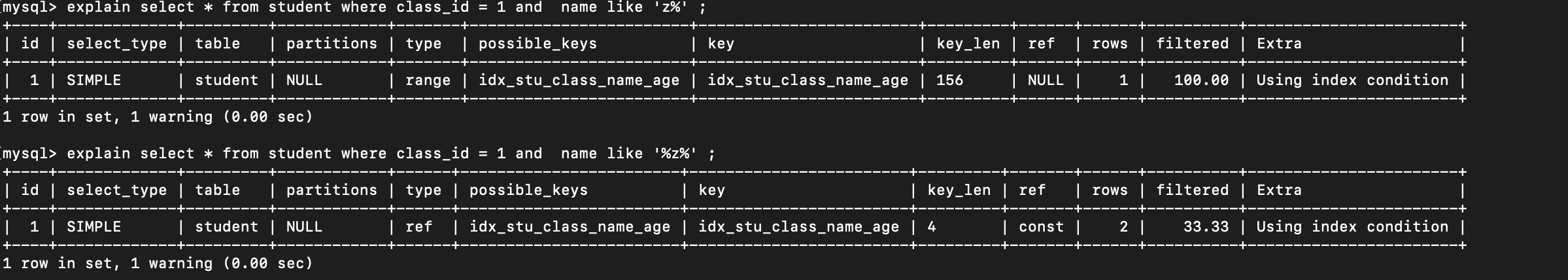 LIKE '%abc'或LIKE '%abc%'会导致索引失效(无法利用前缀匹配)。LIKE 'abc%'可正常使用索引(后缀匹配,符合最左前缀)。此时age索引列也生效了