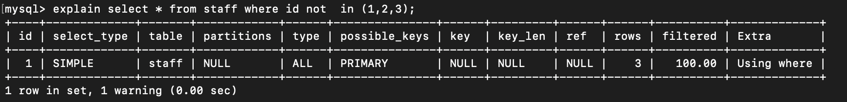 IN条件值过多(超过range_optimizer_max_mem_size默认 8M)或值接近表记录数,可能触发全表扫描。- 未使用覆盖索引(查询字段超出索引包含的列,需回表取数据,效率降低)。