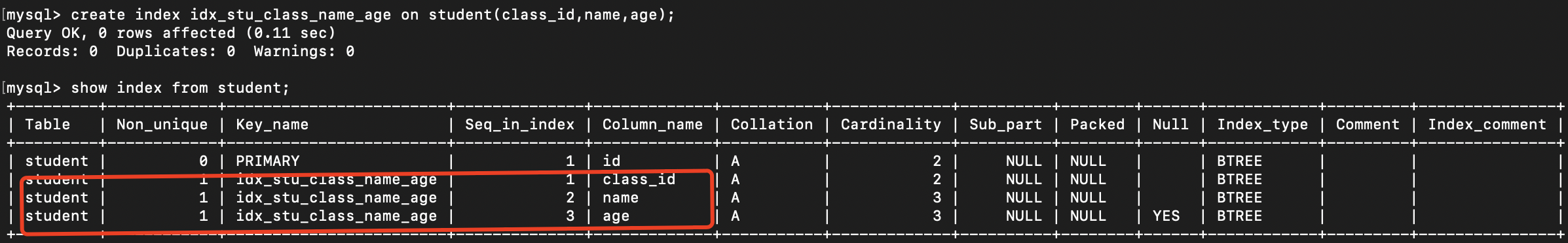 该命令会返回索引的详细信息,包括索引名、列名、Cardinality 等。