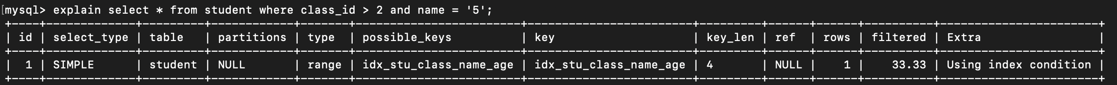 (class_id, age),查询WHERE class_id = 1 AND age > 10,ICP 会在索引中先过滤age > 10,再回表,减少无效回表。