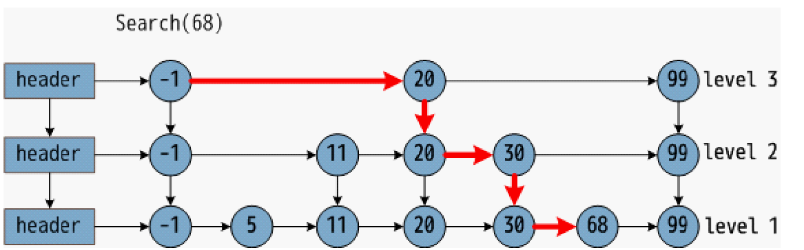 - 如果一个元素出现在leveli的链表中,则它在leveli之下的链表也都会出现