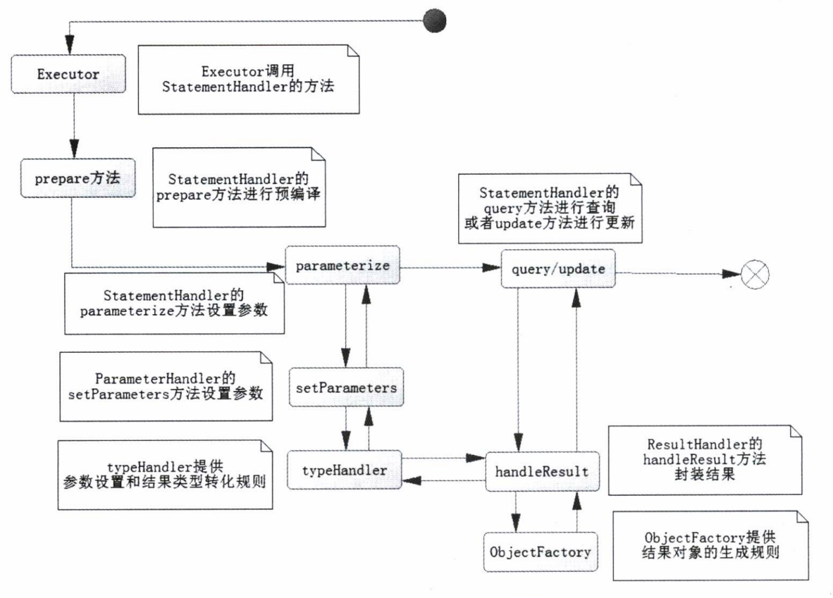MapperProxy(动态代理) → SqlSession → Executor(执行器) → StatementHandler(SQL 执行) → ParameterHandler(参数设置) → 数据库 → ResultSetHandler(结果封装) → 业务对象