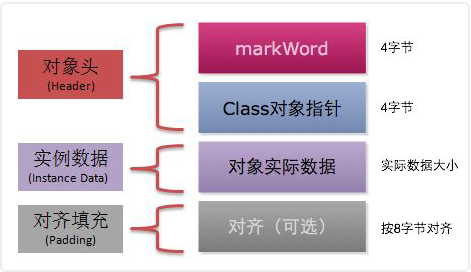 对象在堆中的内存布局分为三部分:对象头、实例数据、对齐填充,以 64 位 HotSpot 为例: