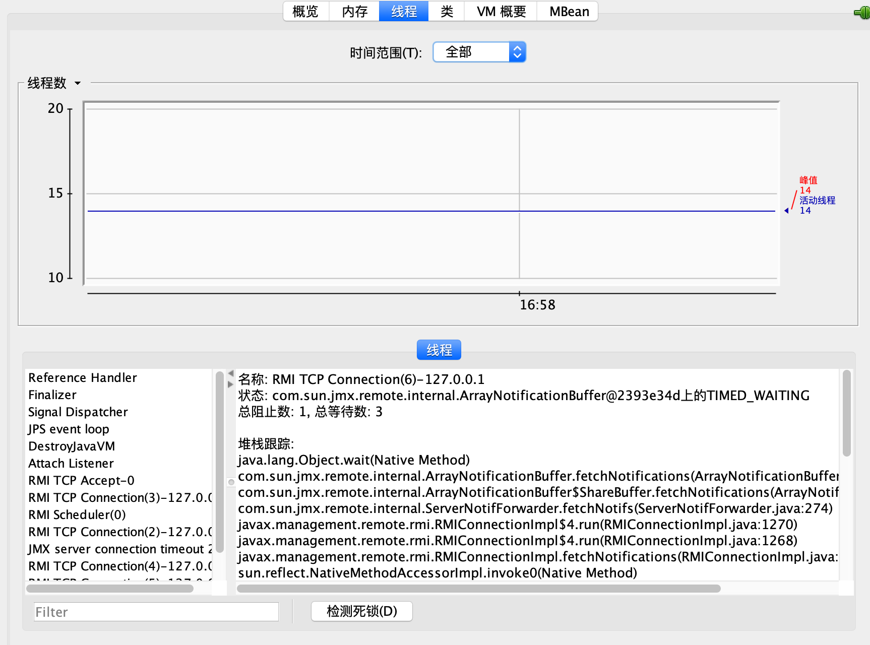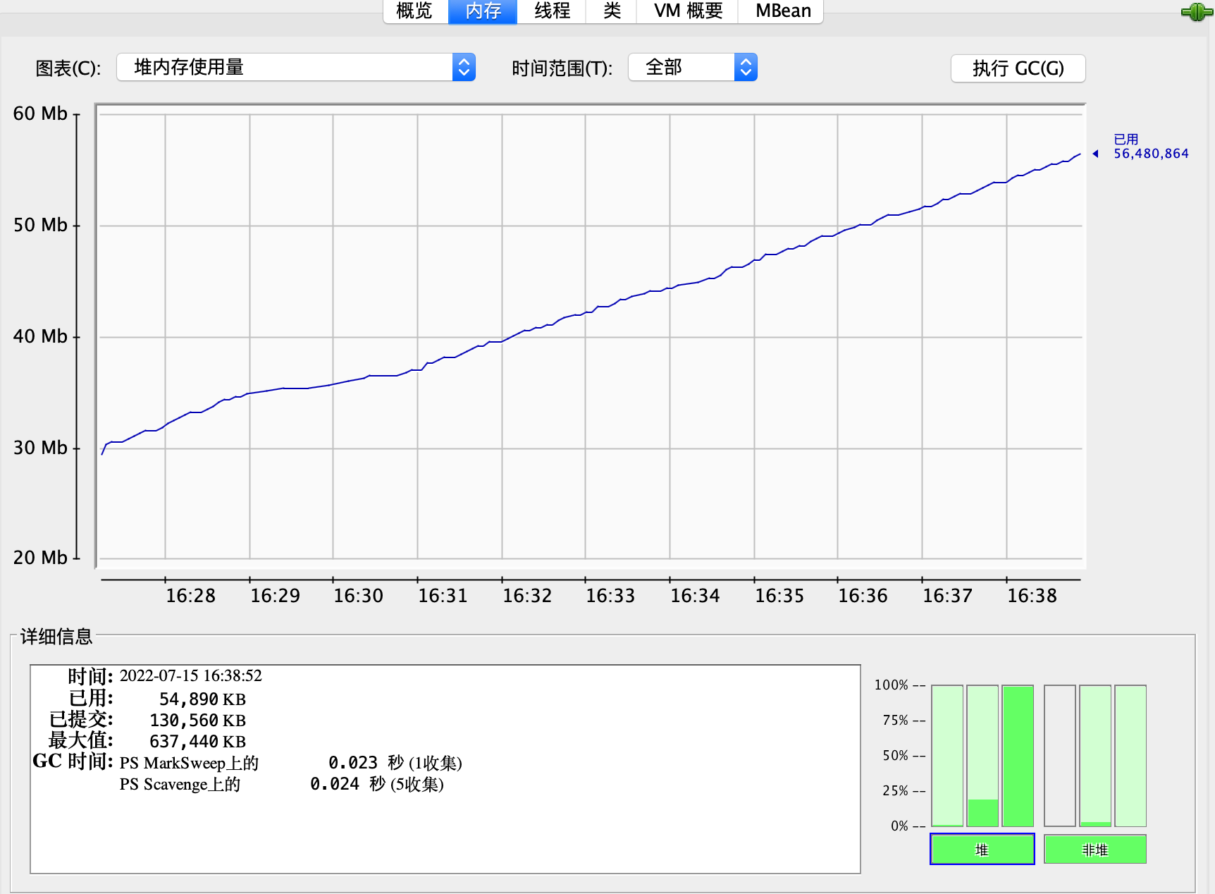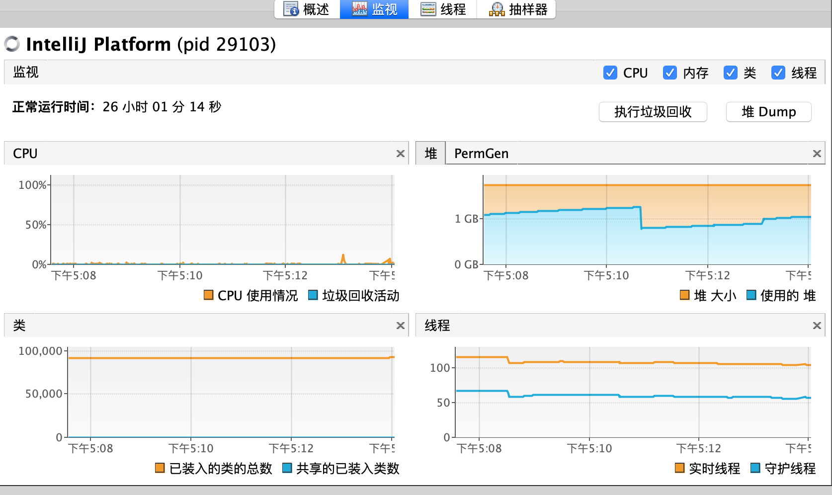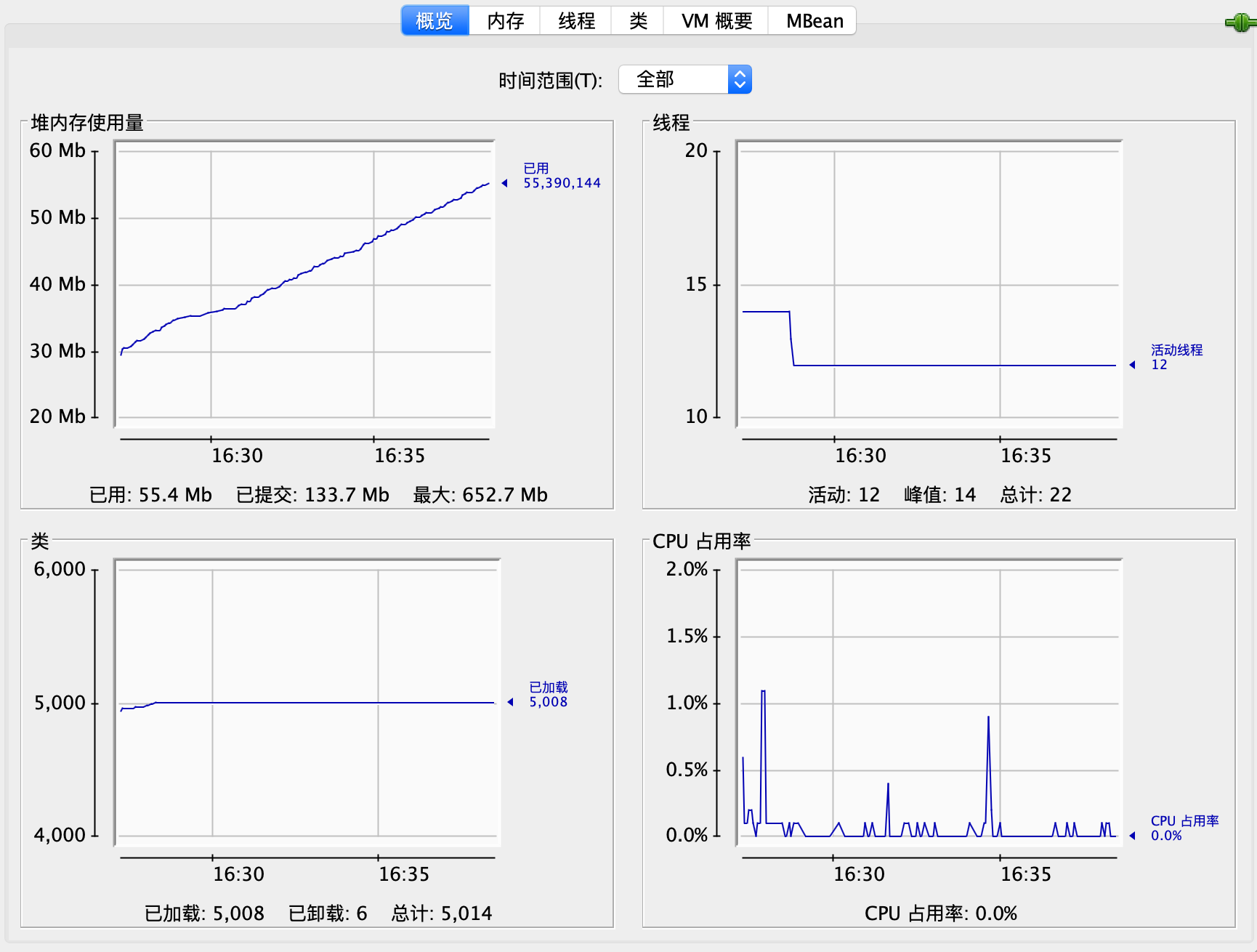 概览:CPU、堆内存、线程、类加载的实时曲线;