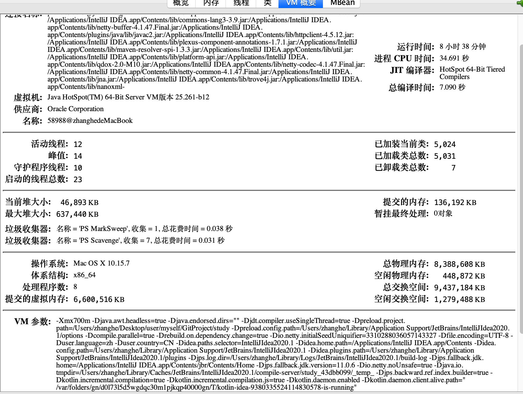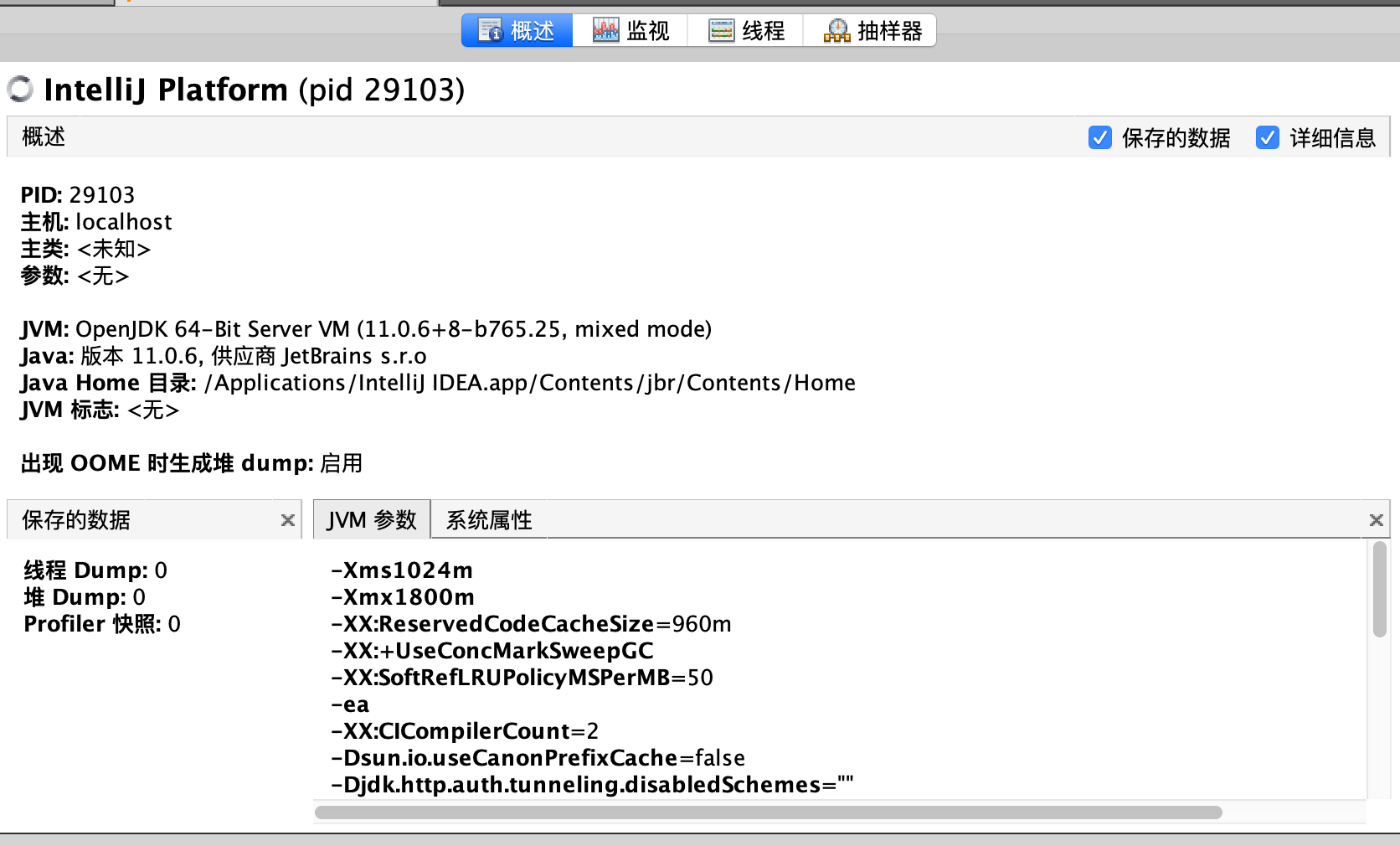 概览:显示进程基本信息(PID、主类、JVM 参数);