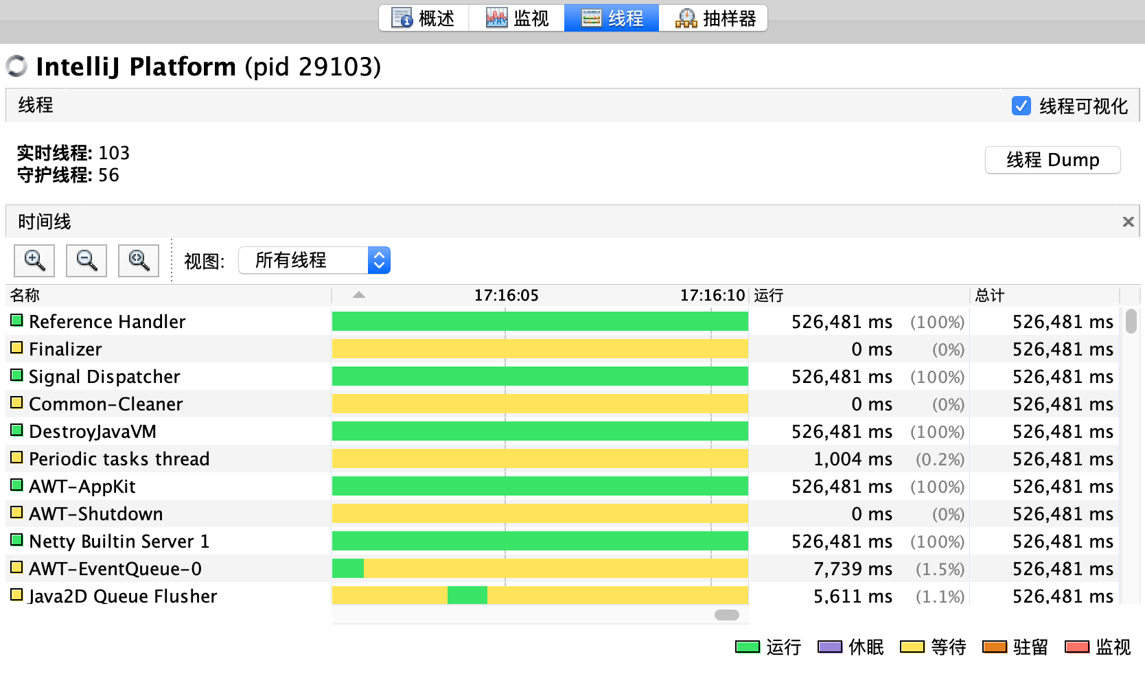类加载统计 | Loaded (加载类数)、Unloaded (卸载类数)、Time (类加载耗时) |