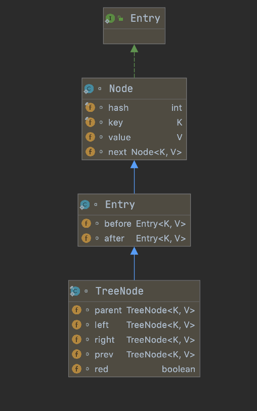 节点结构(Node 与 TreeNode) (1)链表节点 Node 1 2 3 4 5 6 7 8 9 10 11 12 13 static class Node <K ,V > implements Map .Entry <K ,V > { final int hash; final K key; V value; Node<K,V> next; Node(int hash, K key, V value, Node<K,V> next) { this .hash = hash; this .key = key; this .value = value; this .next = next; } }