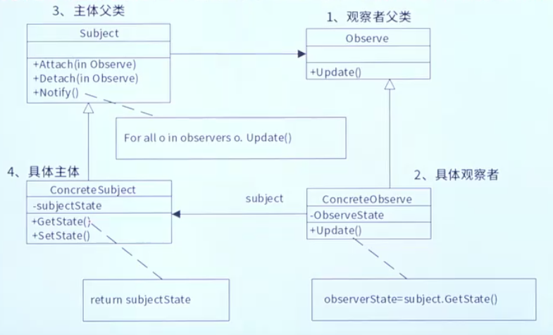 - 定义观察者的接口,声明接收通知并更新自身的方法(通常名为