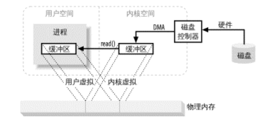 - DMA 控制器直接将磁盘数据传输到一块物理内存(同时映射到内核虚拟地址和用户虚拟地址)。