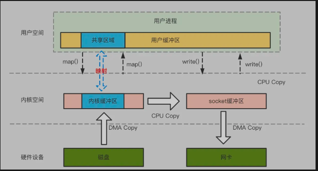 系统调用将磁盘文件映射到内核缓冲区,同时让用户缓冲区与该内核缓冲区共享物理内存。 - 数据读取:DMA 引擎将磁盘数据拷贝到内核缓冲区(1 次拷贝),用户程序可直接访问该数据(无需第二次拷贝)。