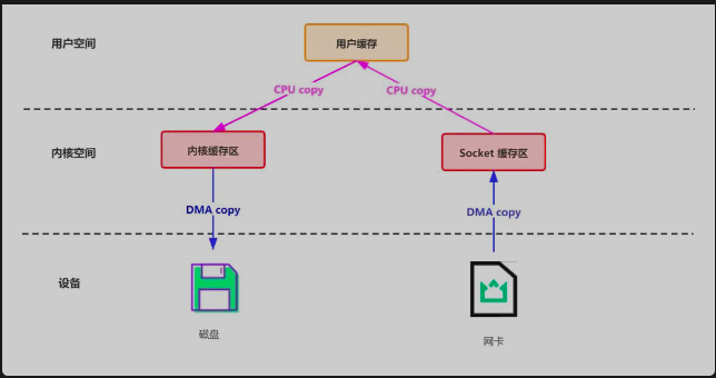 - 4 次数据拷贝:其中 2 次涉及 CPU 拷贝(第二次和第三次),消耗计算资源。