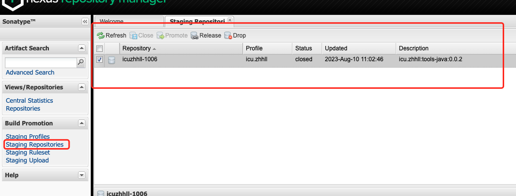 - 进入 Staging Repositories,找到刚部署的仓库(通常以