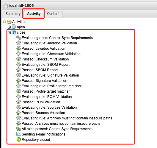 Failed to close staging repository ... due to failing rules - 解决:查看 Nexus 控制台的Activity日志,常见原因包括: