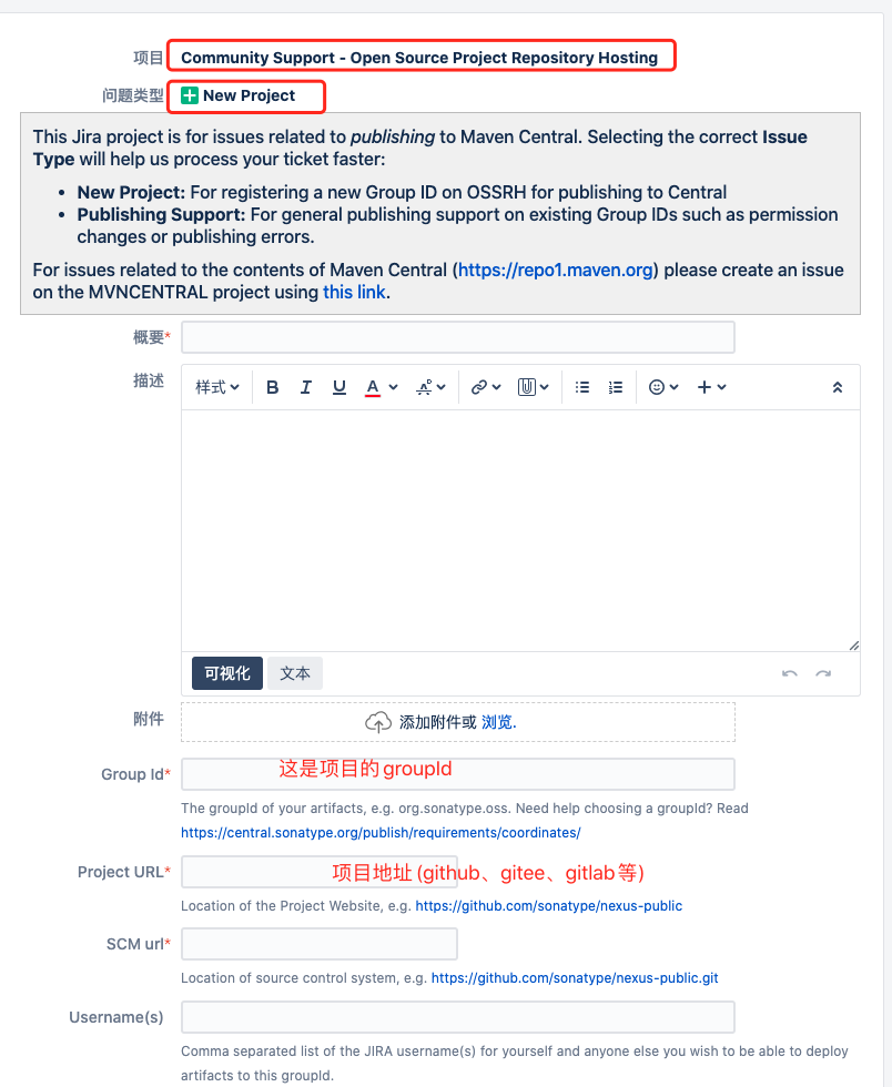 OSSRH-12345)。若使用代码平台域名:在代码仓库中创建一个与 JIRA issue 同名的公共仓库(如