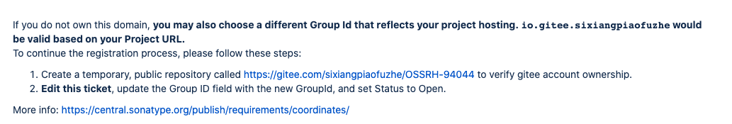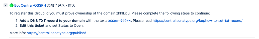 提交申请后,Sonatype 工作人员会在 1-2 个工作日内回复,要求验证 GroupId 所有权: